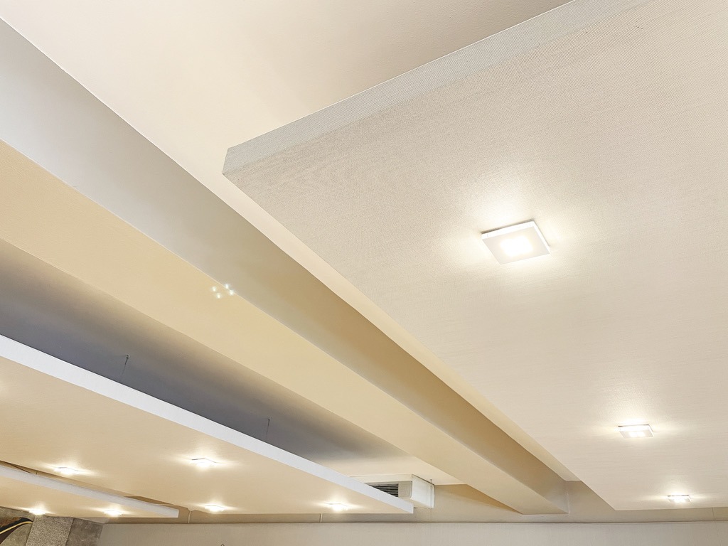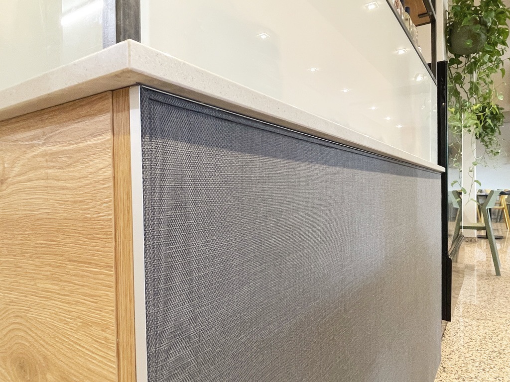 Abbiamo affrontato la soluzione del problema utilizzando soluzioni diverse e complementari tra loro, intervenendo a parete, a soffitto e perfino a rivestimento di alcuni arredi esistenti. Abbiamo realizzato una parete unica fonoassorbente di 9 ml in altezza 2,5 m, accoppiando al materassino Texlimat da 40 mm un rivestimento di Soltis Touch colore Rafia, tensionato su profili Texlit Standard. A soffitto sono stati installati 5 pannelli sospesi di cm 350×200, distanti 25 cm dal soffitto, realizzati con tessuto Soltis Touch tensionato su un telaio di alluminio e profili Aero W light. Sulla superficie inferiore dei pannelli abbiamo integrato il sistema di illuminazione a Led, ottenendo la massima sintesi tra controsoffitto, fonoassorbenza, illuminazione ed estetica. Inoltre sono stati rivestiti i due banconi principali con materassino Texlimat da 10 mm e Soltis Touch colore Carbon tensionato su Texlit standard. A completamento abbiamo installato i tendaggi su tutta la superficie vetrata e una tenda a rullo realizzata con Soltis Touch Carbon. Un intervento a 360°, su più fronti, che ha risolto completamente il problema del riverbero acustico e rinnovando totalmente il look del locale.