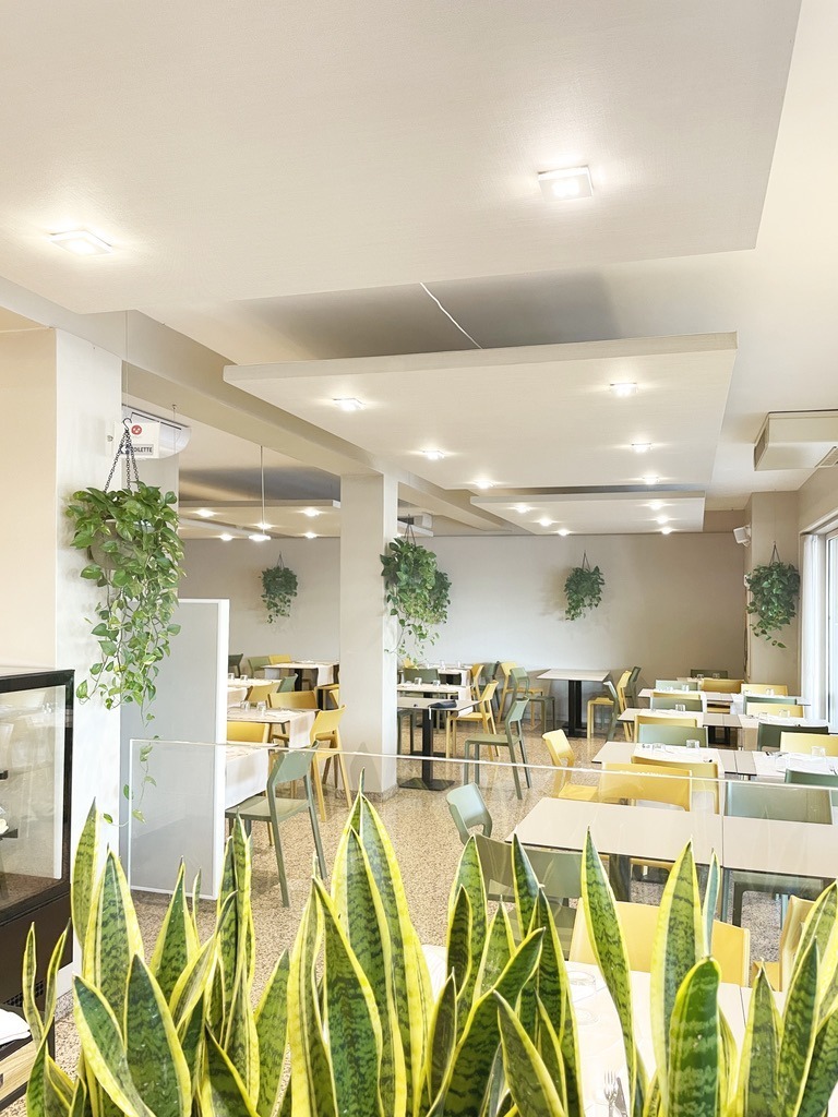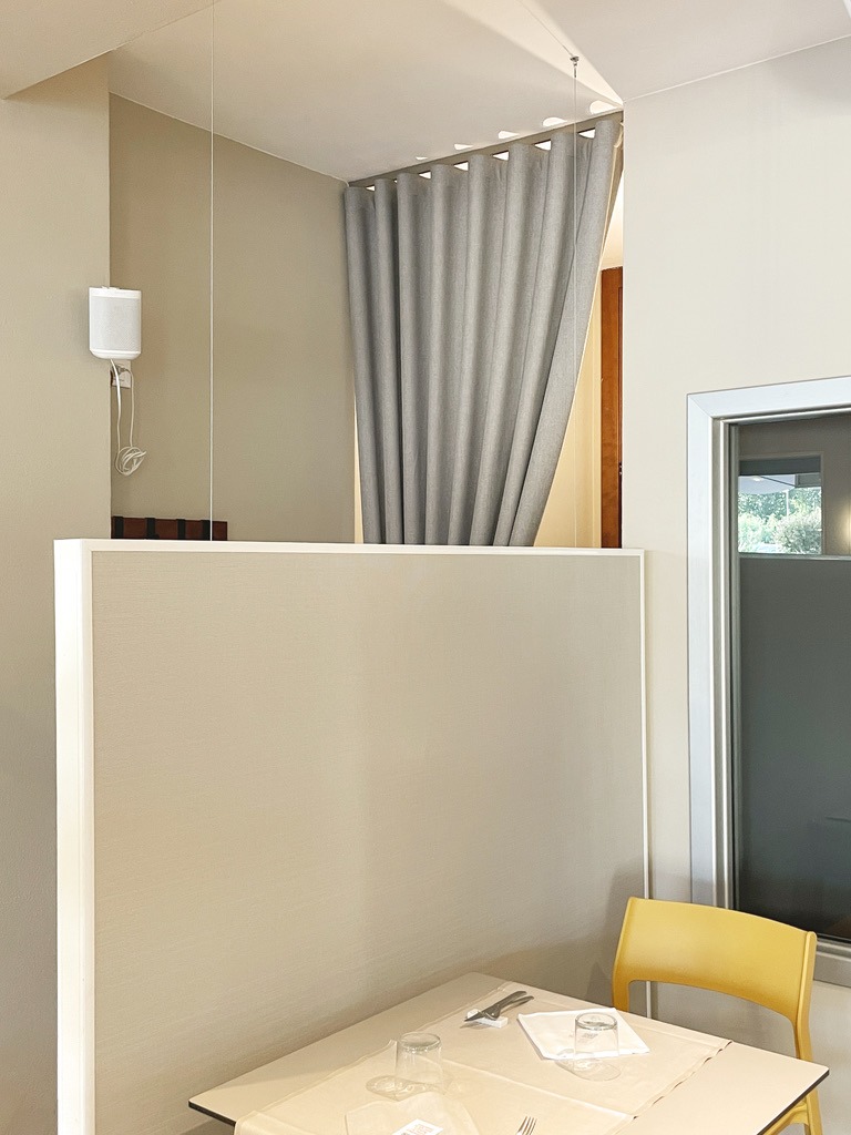 Il problema del riverbero acustico all’interno di questa pizzeria era molto elevato perché lo spazio era molto spoglio e i materiali presenti pessimi per l’assorbimento acustico, pavimento in marmo lucido, pareti intonacate liscie e grandi superfici vetrate senza tendaggi.
