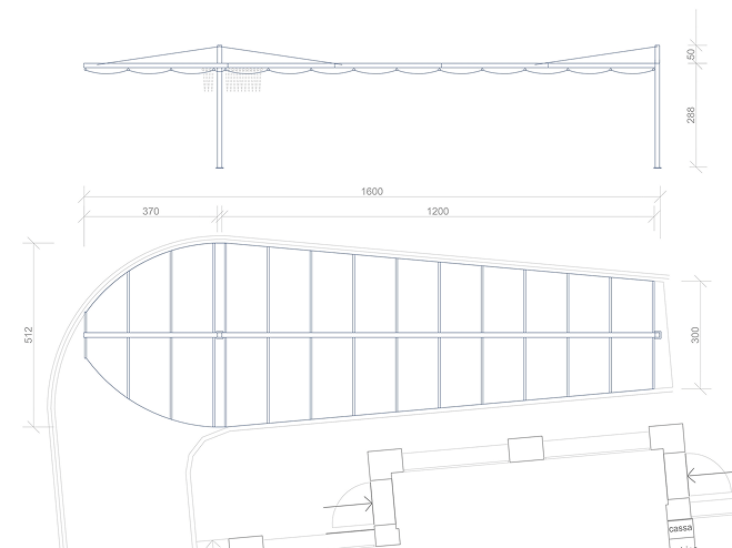 Grazie alla versatilità strutturale delle nostre Vele Scorrevoli e all’approccio progettuale personalizzato è stato possibile realizzare una soluzione in grado di seguire perfettamente l’andamento della recinzione, come un vestito su misura in ogni dettaglio, senza perdere il minimo spazio coperto. L’albero centrale della Vela ha una lunghezza di 16 metri, suddivisi in due parti, la più lunga di 12 metri che costituisce l’asse della copertura principale a forma trapezoidale e la più corta di 4 metri, totalmente a sbalzo rispetto al sostegno centrale, che sostiene la parte finale a forma circolare. Una sintesi totale che ha permesso di plasmare su misura una copertura di 63 mq con due soli sostegni. La complessità iniziale sembra svanita grazie alla semplicità del risultato finale.