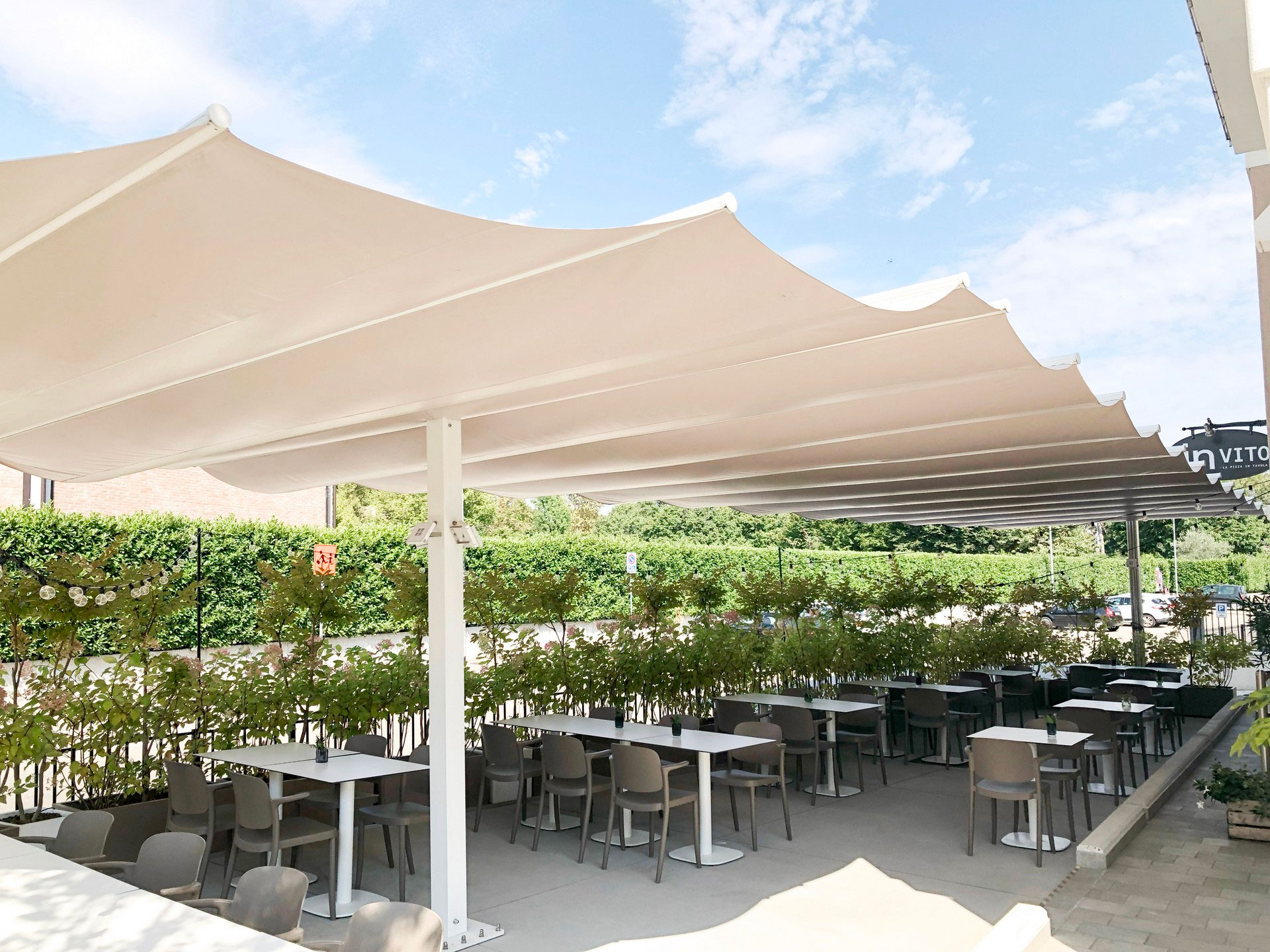 La forma irregolare del dehors legata alla necessità di coprire il maggior spazio possibile non consentiva l’utilizzo di una Vela standard, ne tanto meno di ombrelloni.