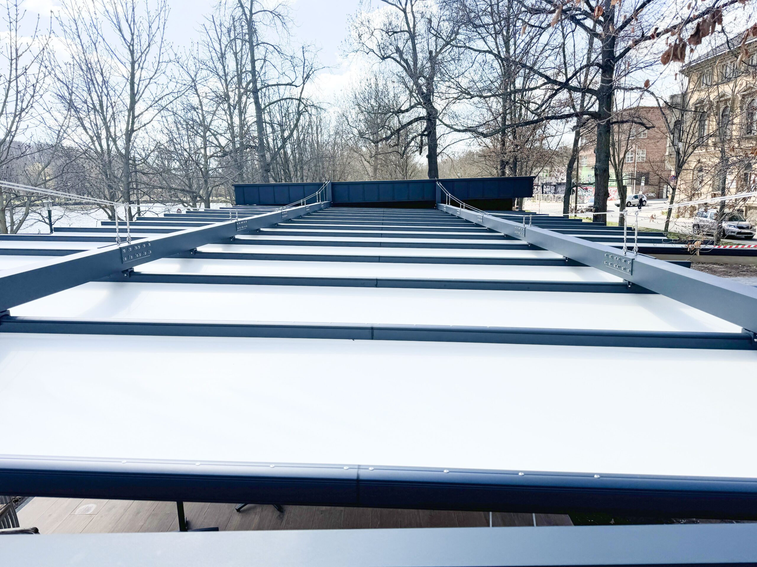 Lunghezza da 14.75 a 22.77 m - Larghezza da 6 a 8 m Vela a doppio binario con sei sostegni fino a 180 mq
