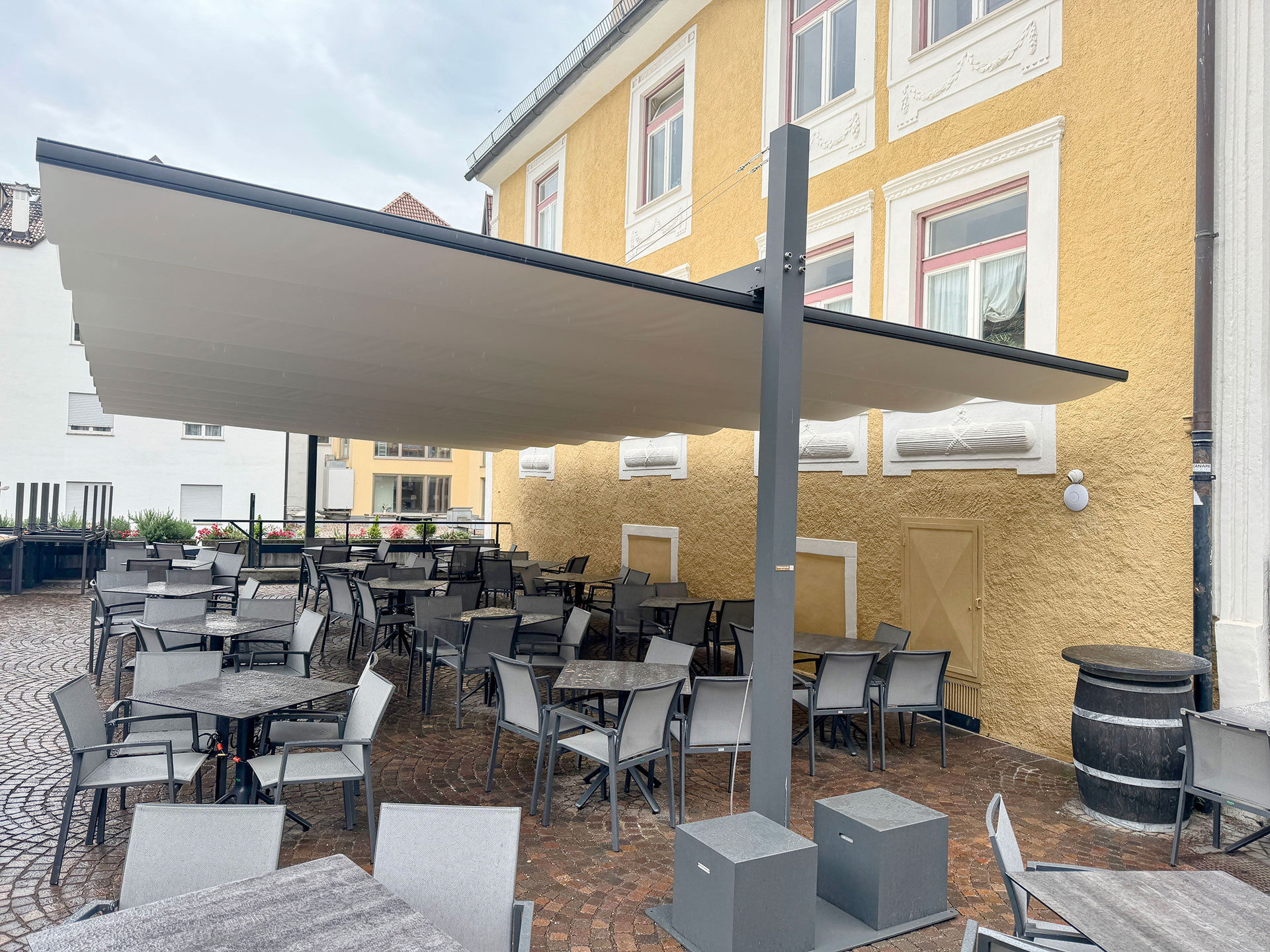 Siamo in piazza Duomo a Merano e il dehors di 75 mq del Ristorante Luisl’s Keller si sviluppa su suolo pubblico. La necessità di sostituire gli 8 ombrelloni a sostegno e piastre centrali con una Vela Scorrevole unica, con campata di 12,5 m senza alcun sostegno nel mezzo, doveva integrarsi con il contesto storico-paesaggistico e le relative direttive comunali. Non vi era la possibilità di ancorarsi in modo stabile alla pavimentazione di sanpietrini e si doveva riprendere la stessa verniciatura degli arredi urbani già presenti sulla piazza.