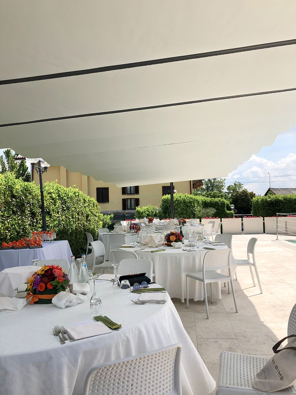 Tuttavia, uno dei punti di forza della location si era trasformato in una criticità importante: l’intera area esterna necessitava di una copertura efficace e funzionale. Inizialmente era stata scelta una soluzione con una fila di ombrelloni che, però, limitava fortemente l’utilizzo dello spazio. I sostegni centrali rendevano difficoltoso, se non impossibile, lo svolgimento delle attività e l’allestimento degli eventi.